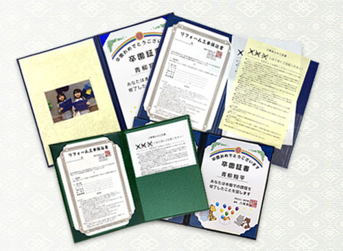証書ホルダーだけでなく、賞状印刷、持ち帰り用手提げ袋、収納箱、化粧( 貼り) 箱までもセットで対応可能。複数業者とのやり取りが不要なので、ご担当者様から『まとめて頼めて助かる』とご好評をいただいています。